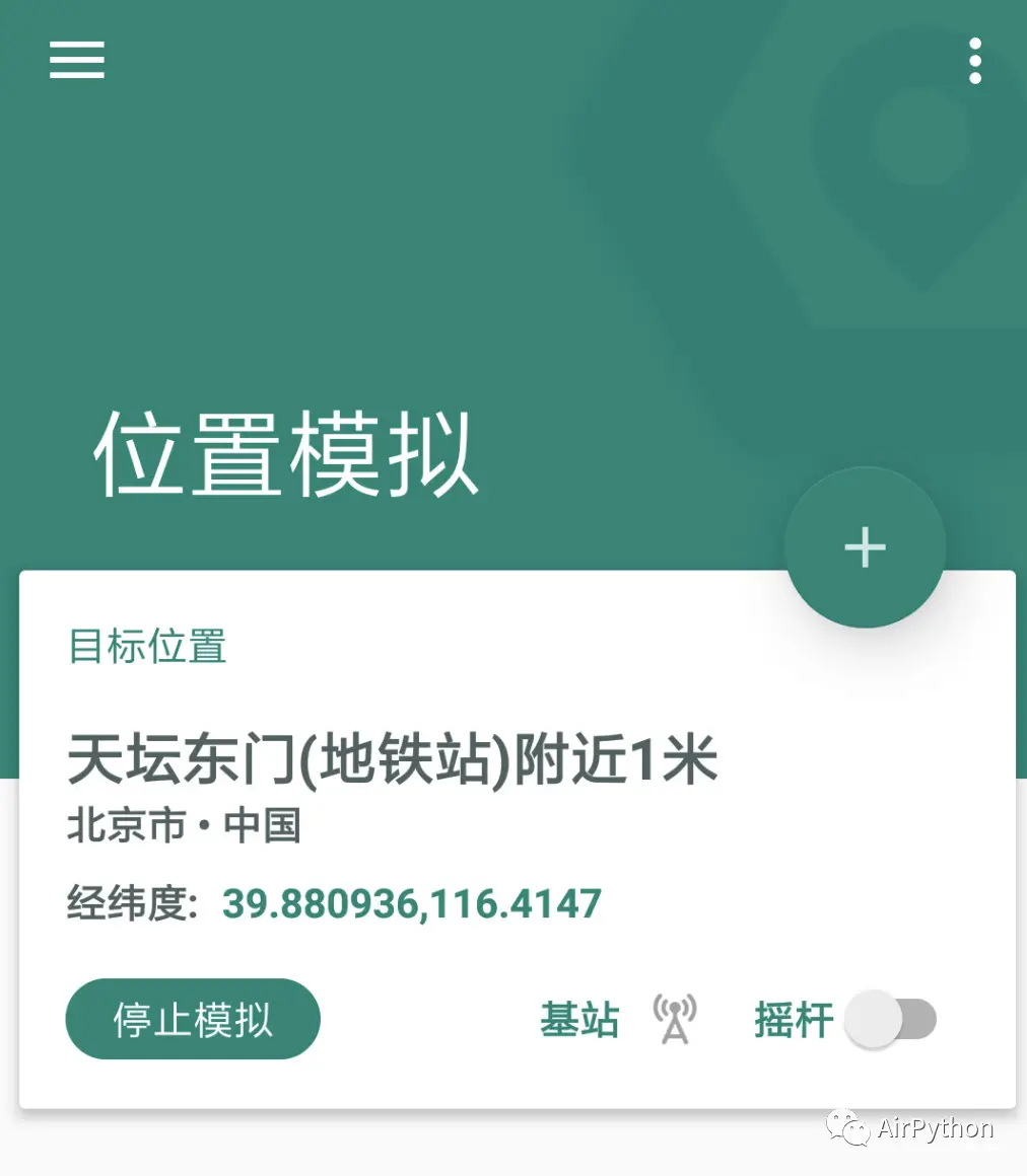 def __mock_location(self): """ 模拟定位 :return: """ home() stop_app(package_name_location) start_my_app(package_name_location, activity_location) # 点击添加位置 self.poco('com.lerist.fakelocation:id/fab').click() # 点击搜索 self.poco('com.lerist.fakelocation:id/m_item_search').click() # 输入框输入目的地 self.poco('com.lerist.fakelocation:id/l_search_panel_et_input').set_text(self.location) sleep(2) # 宽、高 size = self.poco.get_screen_size() # 由于选择结果UI树查找不到,这里使用坐标来执行点击操作 adb_click(500, 283) # 确定位置 while self.poco('com.lerist.fakelocation:id/a_map_btn_done').exists(): self.poco('com.lerist.fakelocation:id/a_map_btn_done').click()第 2 步,通过元素文字内容来判断服务是否开启,如果没有开启,就通过一次点击操作,完成定位服务的开启。