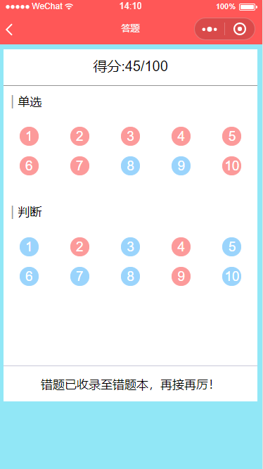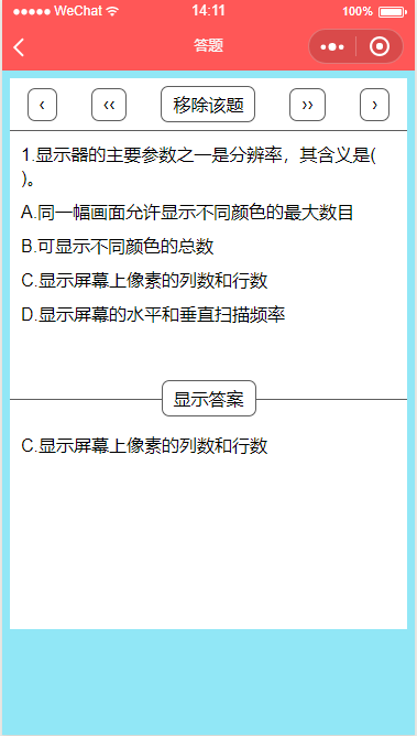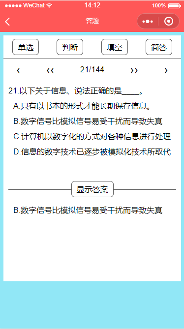 一款功能强大的答题小程序,分为四大功能,答题,学习,排名和错题本,答题功能可以随机从选择的题库中抽取题目作答,学习功能可以浏览全部的题目,并具有记忆功能,下次进入会自动回到学习进度,排名功能可以对每套试卷的作答人员进行分数等排名,错题本会自动记录用户在答题中答错的题目,让用户可以复习,并且可以随时移除题目。 整个小程序非常适合政府、公司和学校进行人员考核、测评等一系列以考促学的活动
