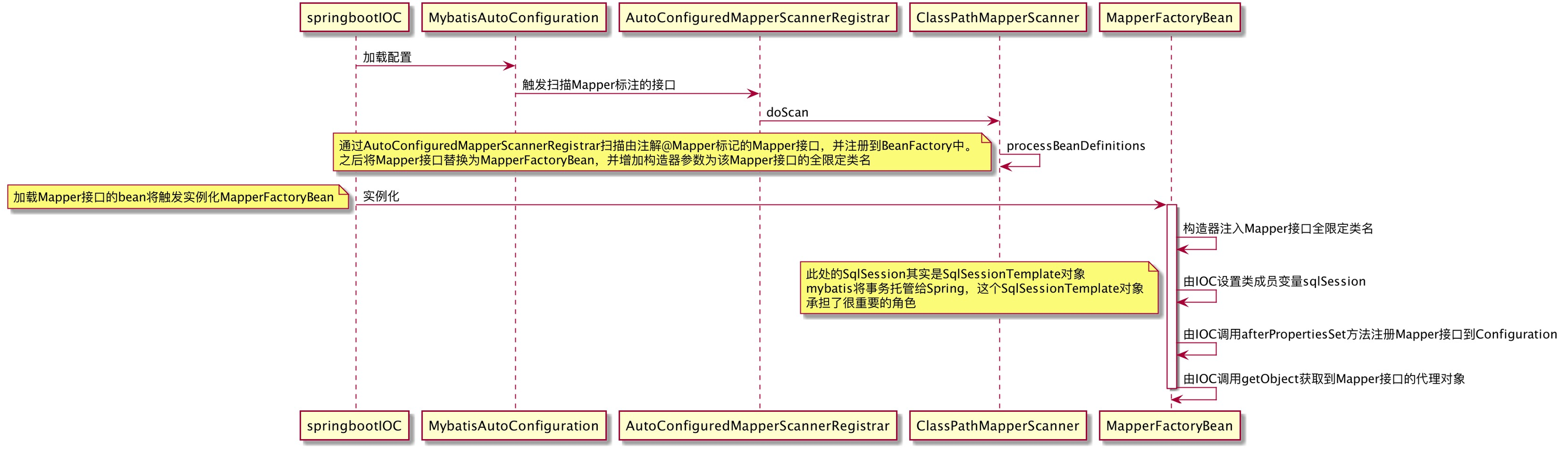 - 实例化完了MapperFactoryBean后,会调用SqlSessionDaoSupport#setSqlSessionFactory、SqlSessionDaoSupport#setSqlSessionTemplate,之后调用DaoSupport#afterPropertiesSet来注册Mapper接口到Configuration中