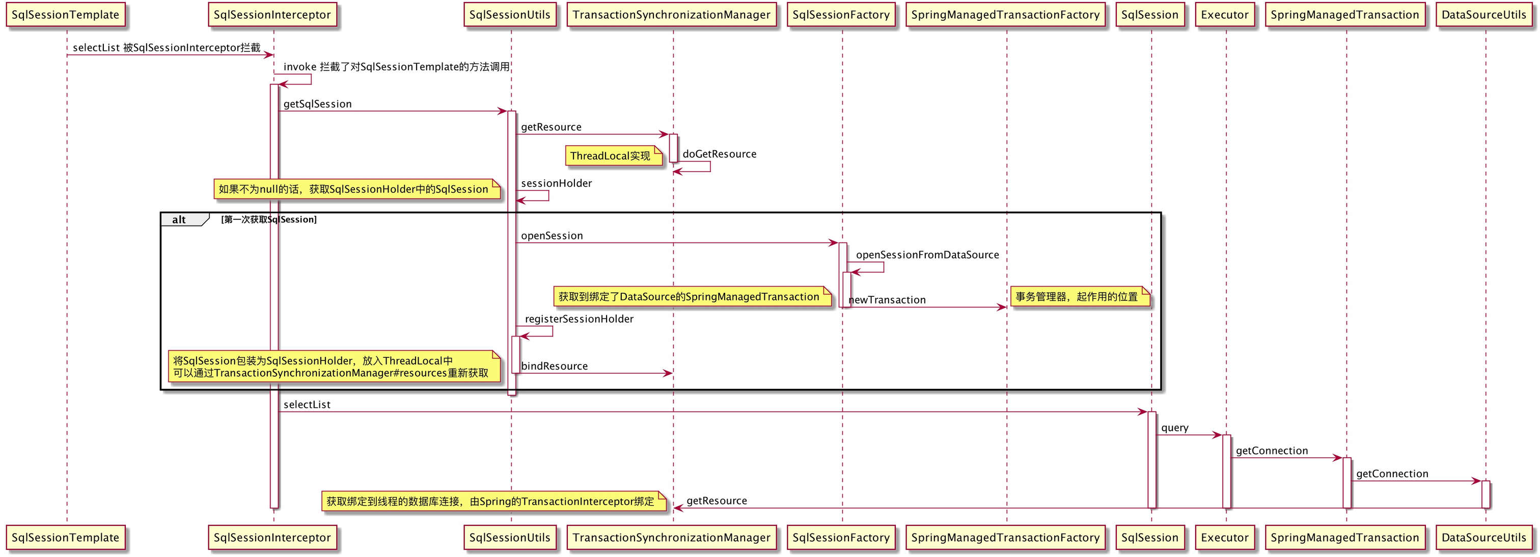 - SqlSessionTemplate委托SqlSessionUtils获取SqlSessionHolder,在SqlSessionUtils内部通过TransactionSynchronizationManager#getResource获取,当第一次获取时通过SqlSessionFactory构造出SqlSession,并绑定到TransactionSynchronizationManager中。当同一个线程再次获取SqlSession时,将获得同一个SqlSession实例。