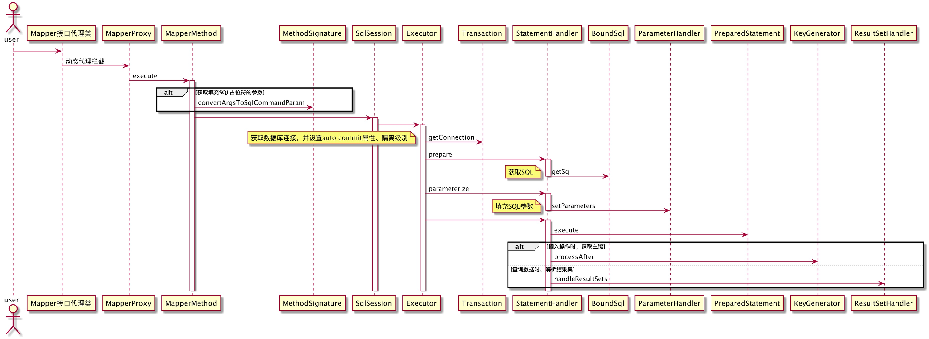 - SQL预编译、参数绑定、结果集处理:StatementHandler、BoundSql、ParameterHandler、ResultSetHandler完成了执行SQL的过程