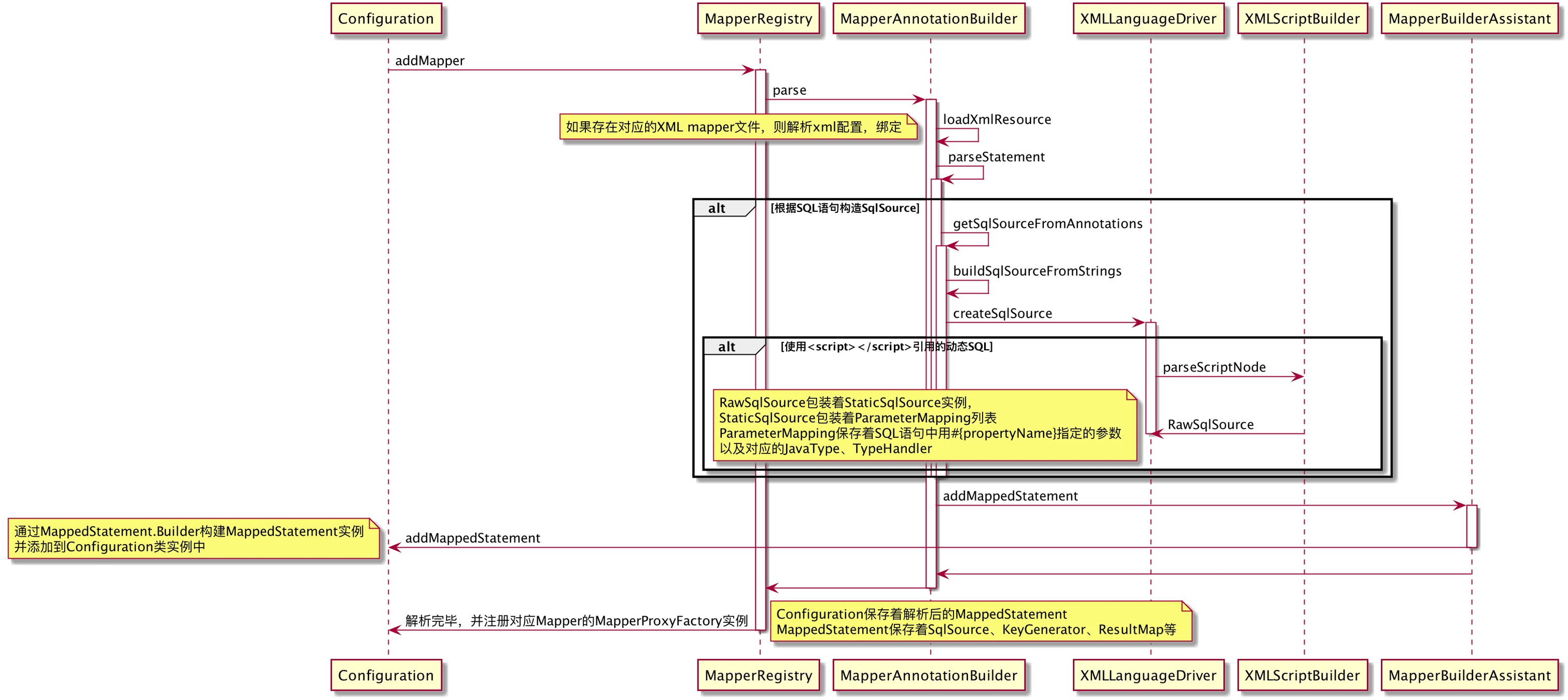 - 通过 **configuration.addMapper(UserMapper.class)**会解析在UserMapper接口中定义的SQL语句,并绑定到Configuration实例中