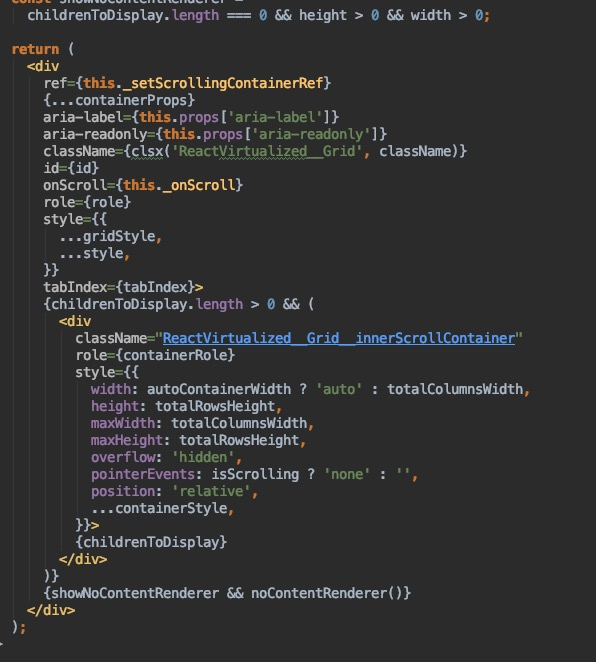 其中react-virtualize库是现在比较流行的虚拟化技术的三方库,现在说一下它的具体实现逻辑。