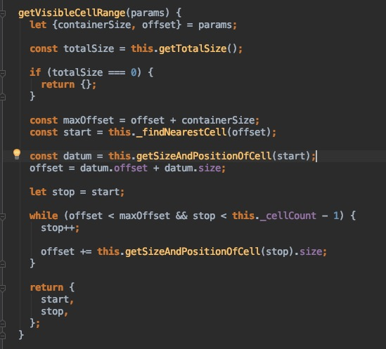 该方法会根据现在的偏移量计算出一个最接近的偏移量的index下标作为开始下标,再加上一个可见区域的高度计算出结束下标,还可以设置一个过渡的列数作为过渡展示区域