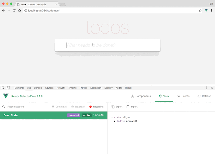 Vue Devtools有一个Vuex选项卡,每当Vuex派发突变时,该选项卡都会记录您的状态。如果状态开始以无法预测的方式运行,这将简化调试状态的过程。还有一项功能可以让您实时浏览Vuex状态的早期版本。