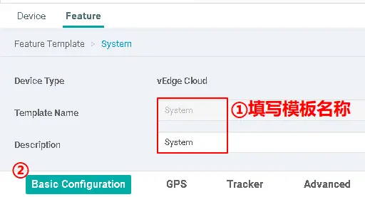 在“Select Devices”,勾选“vEdge Cloud”,然后在“Select Template”,点击'System',按如下所示填写: