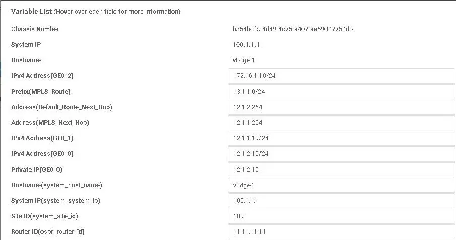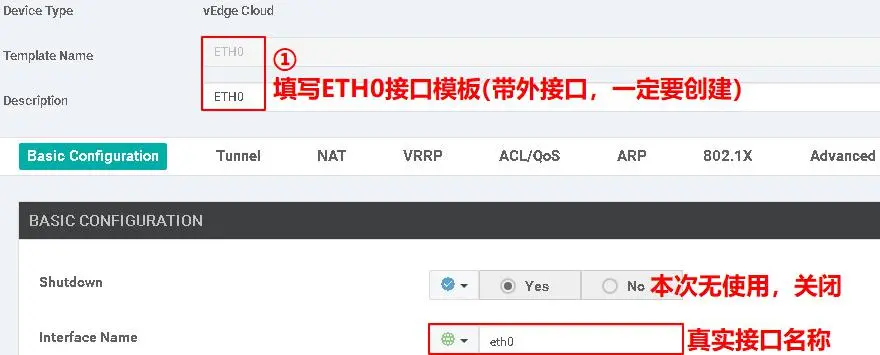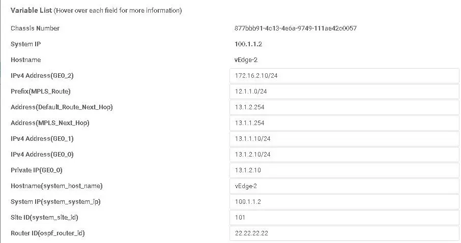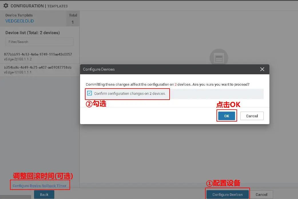 在“Select Devices”,勾选“vEdge Cloud”,然后在“Select Template”,点击'VPN0',按如下所示填写: