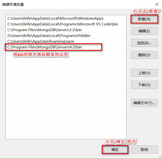 添加环境变量,将mongoDb的bin目录添加到path下。默认的bin目录可在如下地址中找到:C:\Program Files\MongoDB\Server\4.2\bin,找到bin后,将它的绝对地址复制到环境变量中。