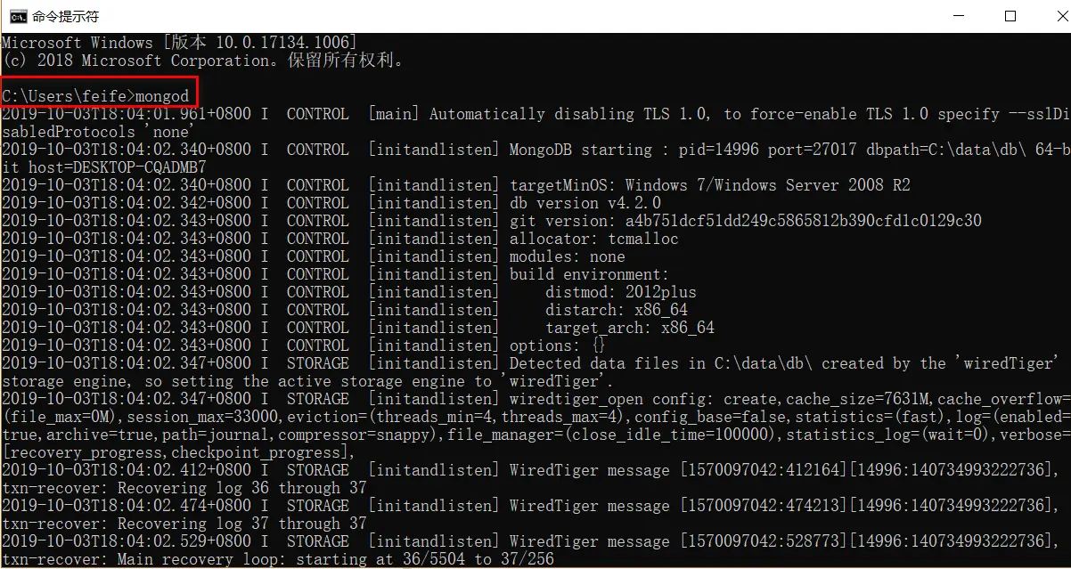 打开命令行窗口输入mongod启动数据库服务器(启动成功,光标会在下方闪烁)