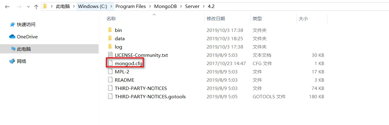 在MongoDB的安装目录添加一个配置文件安装目录:C:\Program Files\MongoDB\Server\4.2