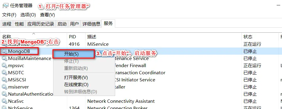 以管理员身份打开命令行窗口 将以下指令复制到命令行中:sc.exe create MongoDB binPath= ""C:\Program Files\MongoDB\Server\3.2\bin\mongod.exe" --service --config="C:\Program Files\MongoDB\Server\3.2\mongod.cfg"" DisplayName= "MongoDB" start= "auto" 5) 打开任务管理器——服务——启动名为MongoDB的服务