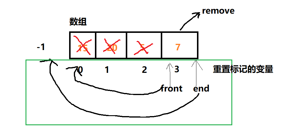 我们可以使用elements变量标记队列中元素的数量,使用front变量标记队首元素在数组的索引,end变量标记队尾元素在数组中的索引。