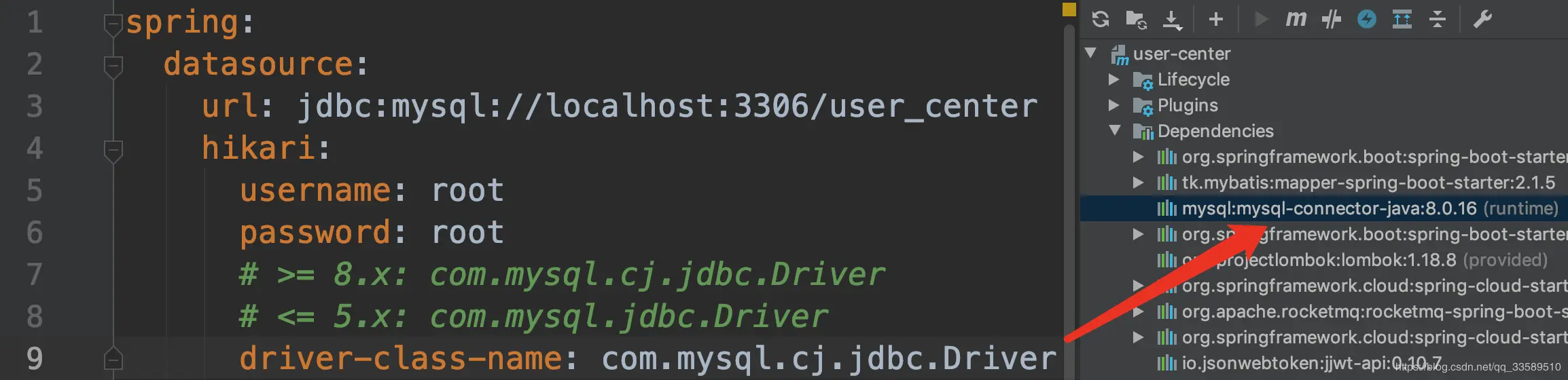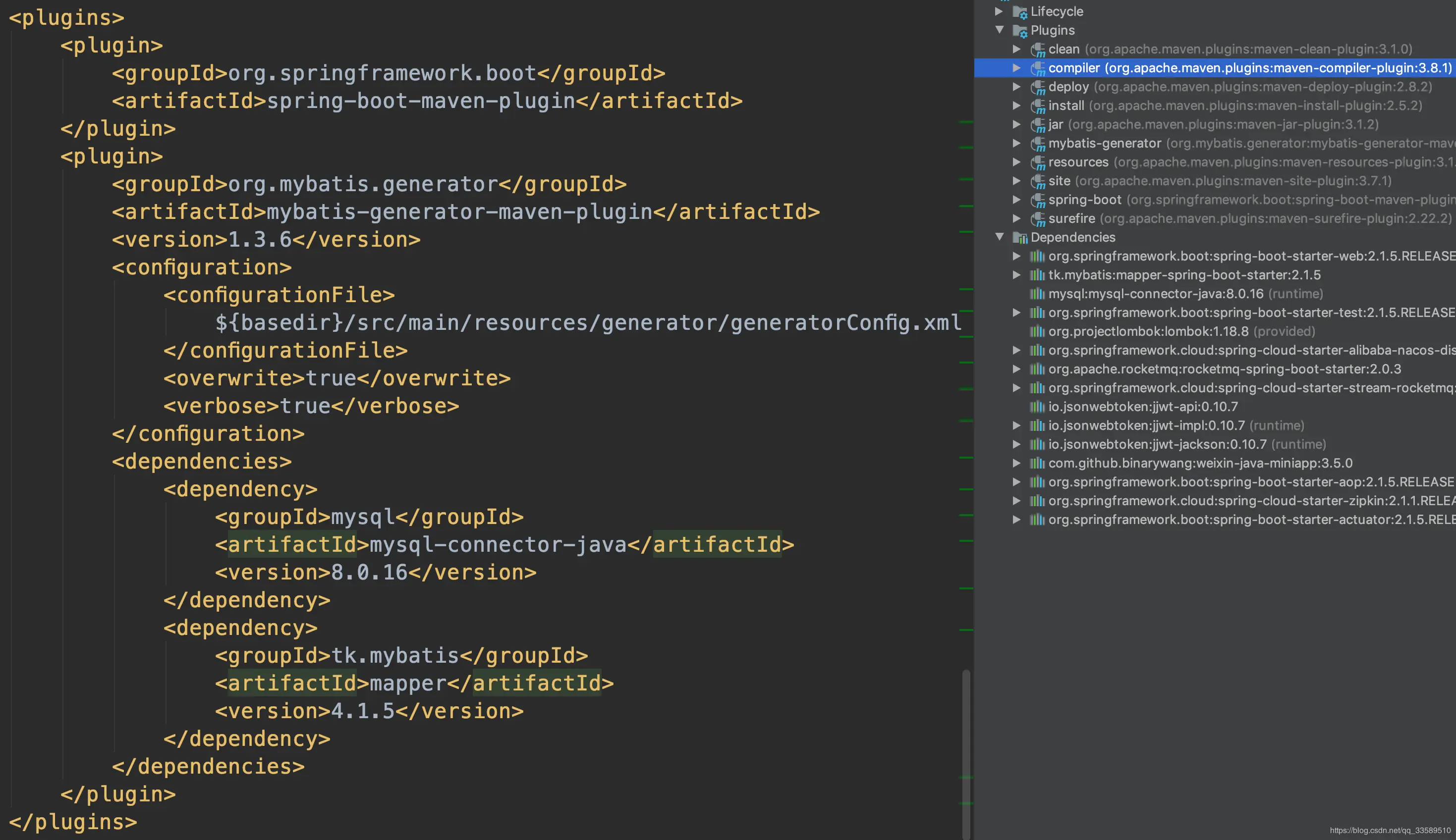 除此之外需要特别注意的是 ,MBG 配置中用到的所有外部代码都必须通过依赖方式配置在这里,否则运行时会提示找不到对应的类而报错。这里有两个必须的依赖,一个是 JDBC 驱动,另一个是 Mapper 的插件。