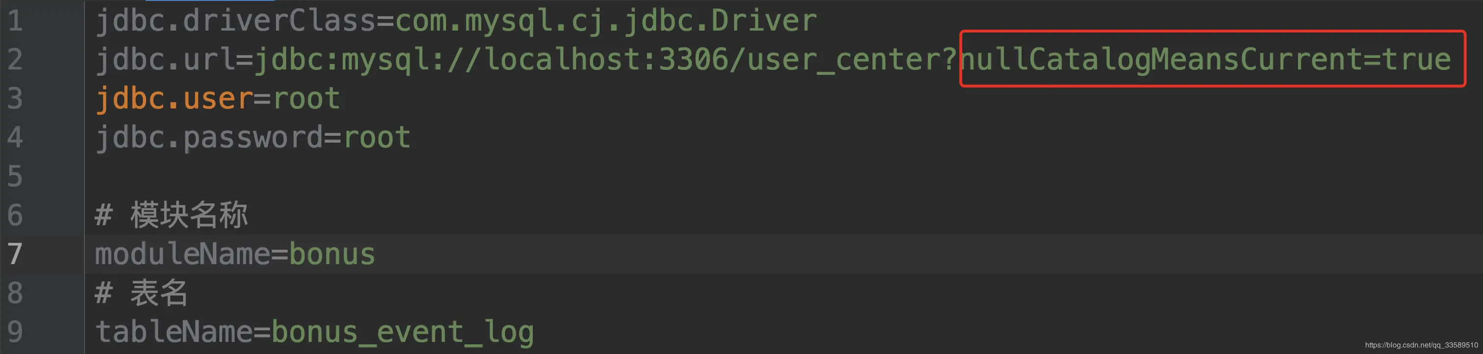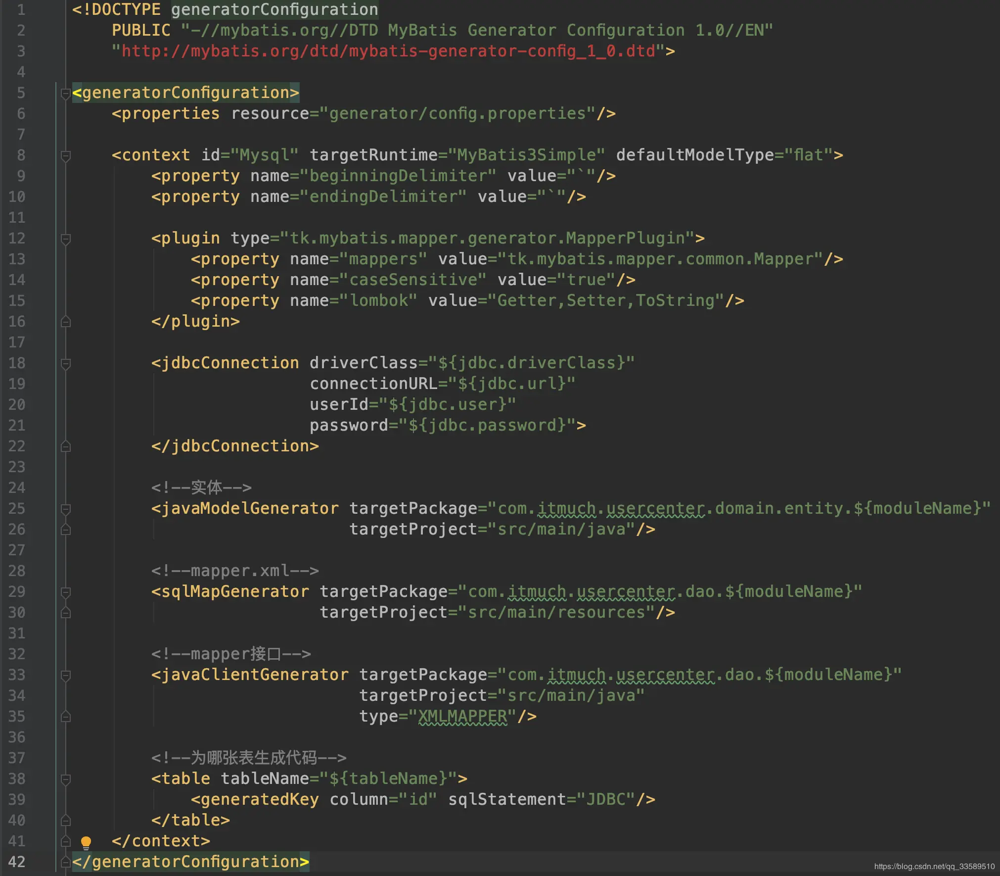 在构造文件中,这里是generatorConfig.xml添加连接数据库参数如下: