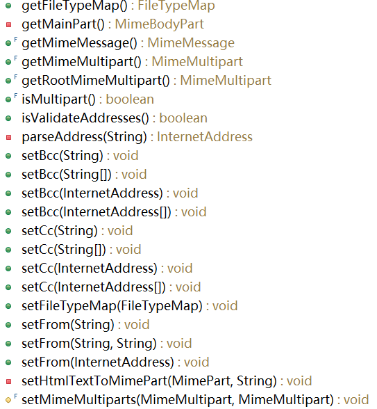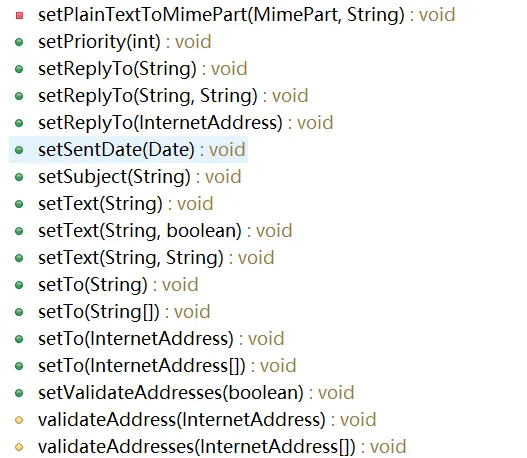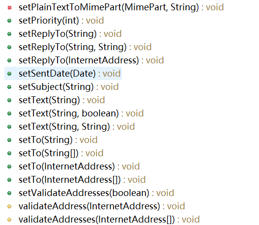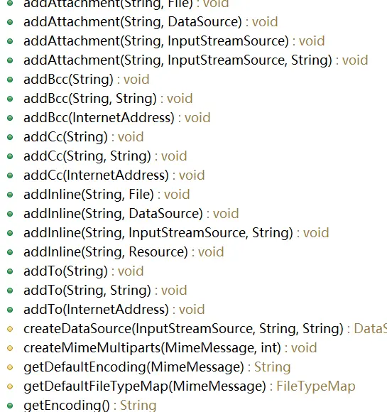 针对上述情况,spring通过MimeMessageHelper,把几乎所有邮件发送需要处理的问题就集中到了这个类里面,使用方便又好找。下面是这个类所有的方法。