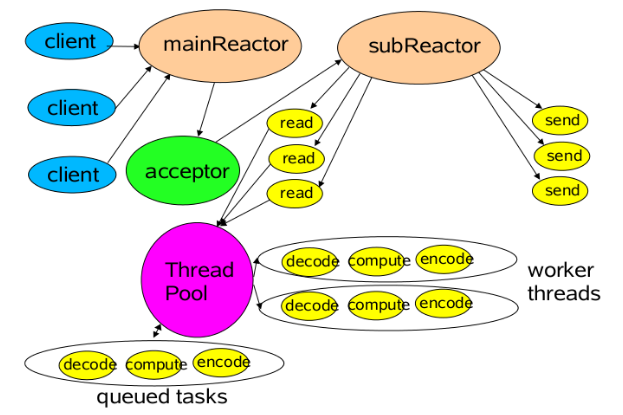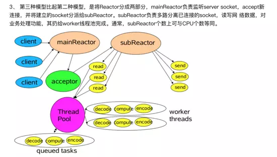 Reactor主从模型 主从Reactor多线程:多个acceptor的NIO线程池用于接受客户端的连接