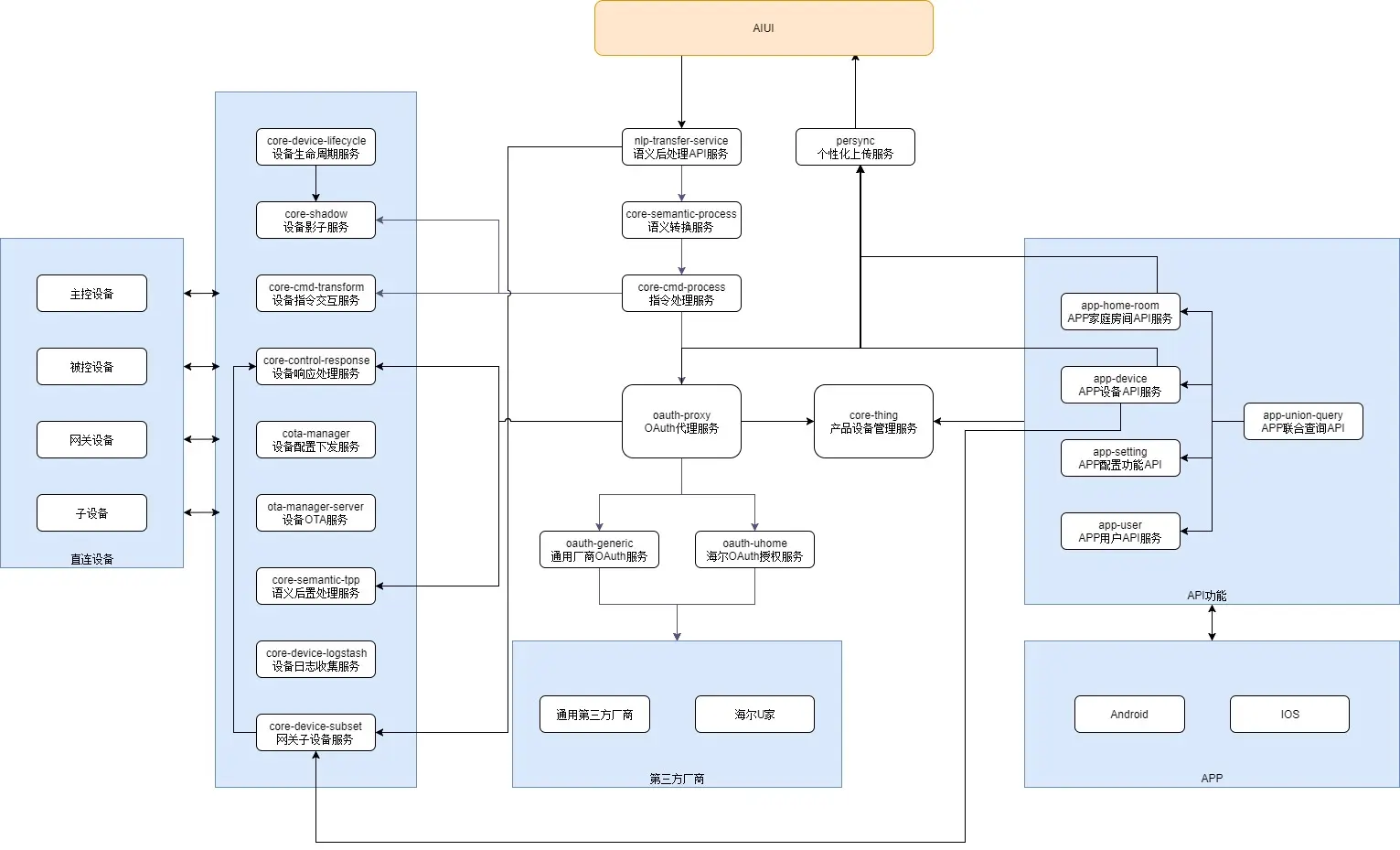 其他服务还有与魔飞交互的服务 ota 和 cota ,分别对魔飞固件升级管理和远程设备配置管理,通过mqtt和魔飞交互。 关于app还有一个服务app-setting 用来提供魔飞app版本更新接口。 core-thing提供grpc接口供其他服务查询不属于自己服务的数据库的信息,如根据uid did查找设备详细信息
