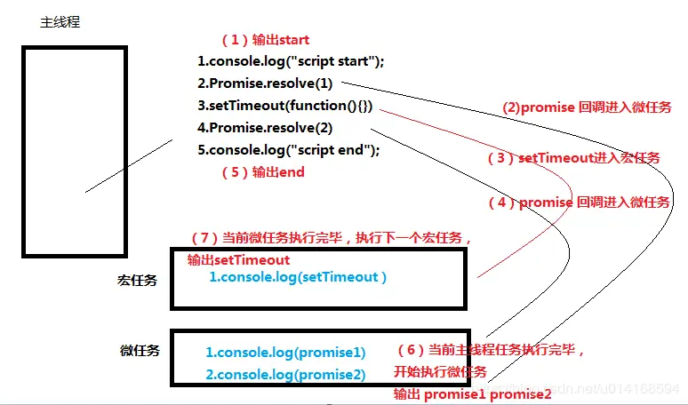 - 微任务(Microtask ):通常来说就是需要在当前 task 执行结束后立即执行的任务,例如需要对一系列的任务做出回应,或者是需要异步的执行任务而又不需要分配一个新的 task,这样便可以减小一点性能的开销。microtask 队列是一个与 task 队列相互独立的队列,microtask 将会在每一个 task 执行结束之后执行。每一个 task 中产生的 microtask 都将会添加到 microtask 队列中,将会添加至当前 microtask 队列的尾部,并且 microtask 会按序的处理完队列中的所有任务,然后开始执行下一个 task 。microtask 类型的任务目前包括了 MutationObserver 以及 Promise 的回调函数。 例子: