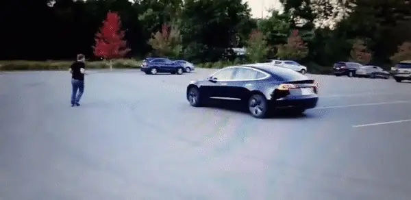 下面这位车主在召唤自己的红色特斯拉的时候,特斯拉开的非常慢,旁边突然闪过的白车差点就撞上。