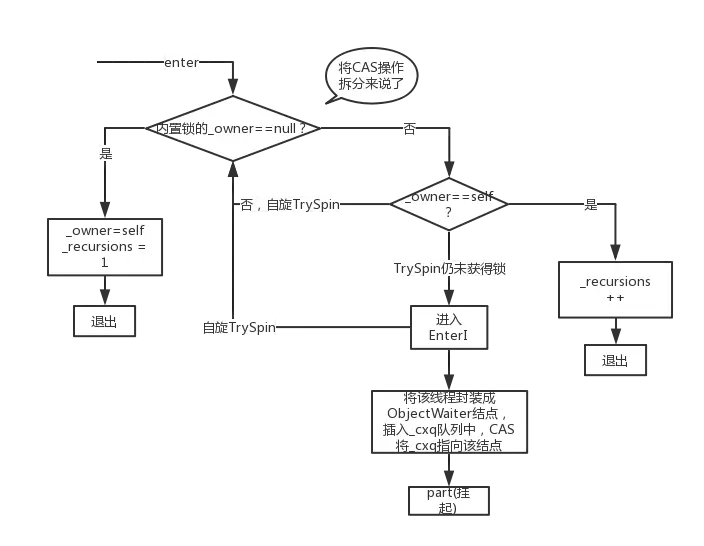在 jdk1.6 之前,synchronized 就直接会去调用 ObjectMonitor 的 enter 方法获取锁(第一张图)了,然后释放锁的时候回去调用 ObjectMonitor 的 exit 方法(第二张图)这被称之为重量级锁,可以看出它涉及到的操作复杂性。