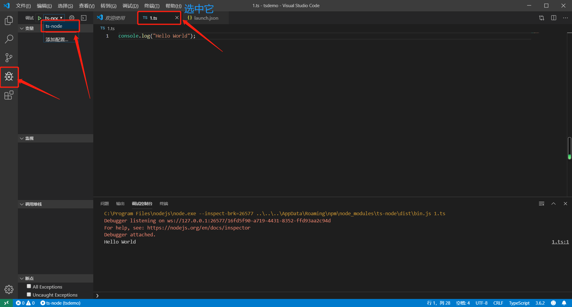在1.ts中输入我们的hello world代码。