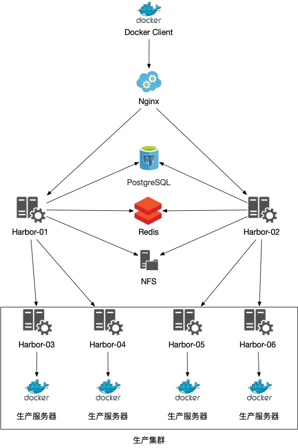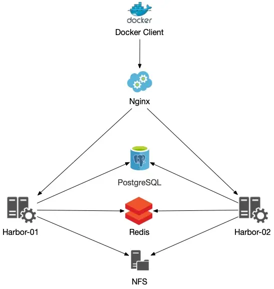 本次搭建以NFS作为共享存储存放Harbor相关data,并分离PostgreSQL与Redis为多个Harbor共同连接使用,使用Nginx做负载均衡。
