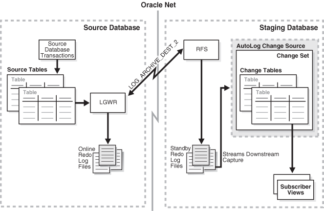 异步在线日志复制CDC模式就要高级很多了,使用Standby Redo Log(热备数据库日志),实际就是使用Oracle的热备机制,将日志写入了热备数据库,目标表就可以建立在热备库上,这对主数据库性能影响就进一步降低。