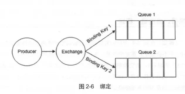 Binding:绑定。RabbitMQ中通过绑定将交换器与队列关联起来,在绑定的时候一般会指定一个绑定键( BindingKey ) ,这样RabbitMQ 就知道如何正确地将消息路由到队列了, 如图