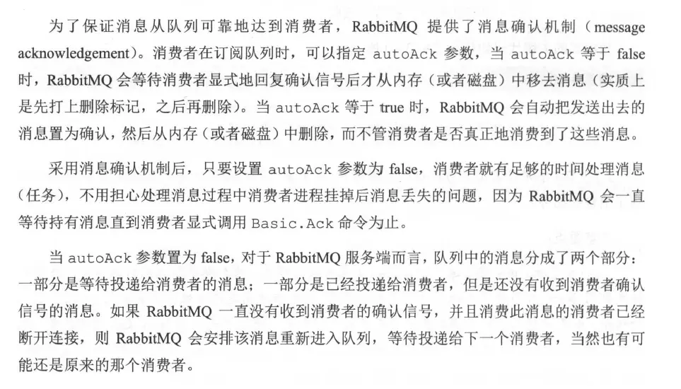 (4 )消费者在消费消息的同时需要将autoAck 设置为false,然后通过手动确认的方式去 确认己经正确消费的消息,以避免在消费端引起不必要的消息丢失。