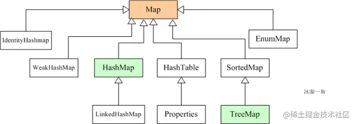 - Map接口的实现类主要有:HashMap、TreeMap、Hashtable、ConcurrentHashMap以及Properties等