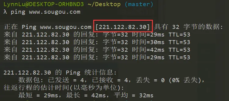 IP的作用是定位一台设备,封装数据报文以与其他设备交流。 使用ping命令查看IP地址,输入ping+域名。
