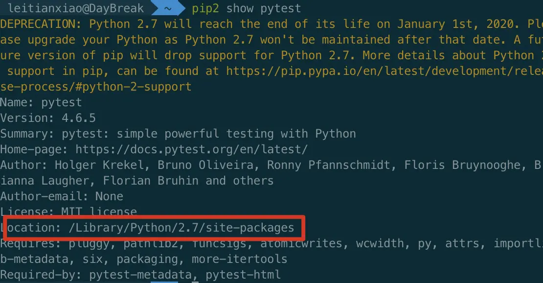pip show 某某已经安装的模块,比如:pip show pytest