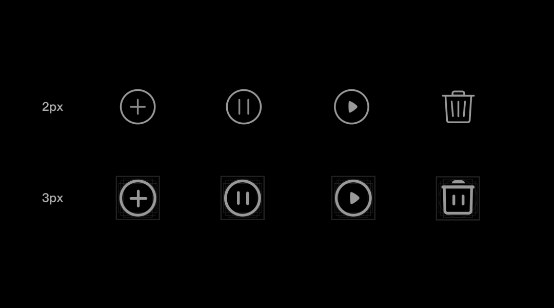 在做一组同等大小的图标时,并不容易发生描边粗细不一致的情况,比如我们很少会把其中三个做成4px,而其中一个做成2px: