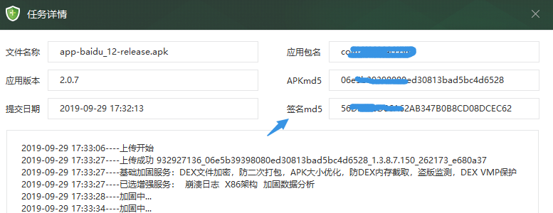 应用签名的获取:因为项目的app都是用360加固的,360加固上在加固应用时在任务详情可以看到,签名md5就是,它是大写的,你弄成小写就是了