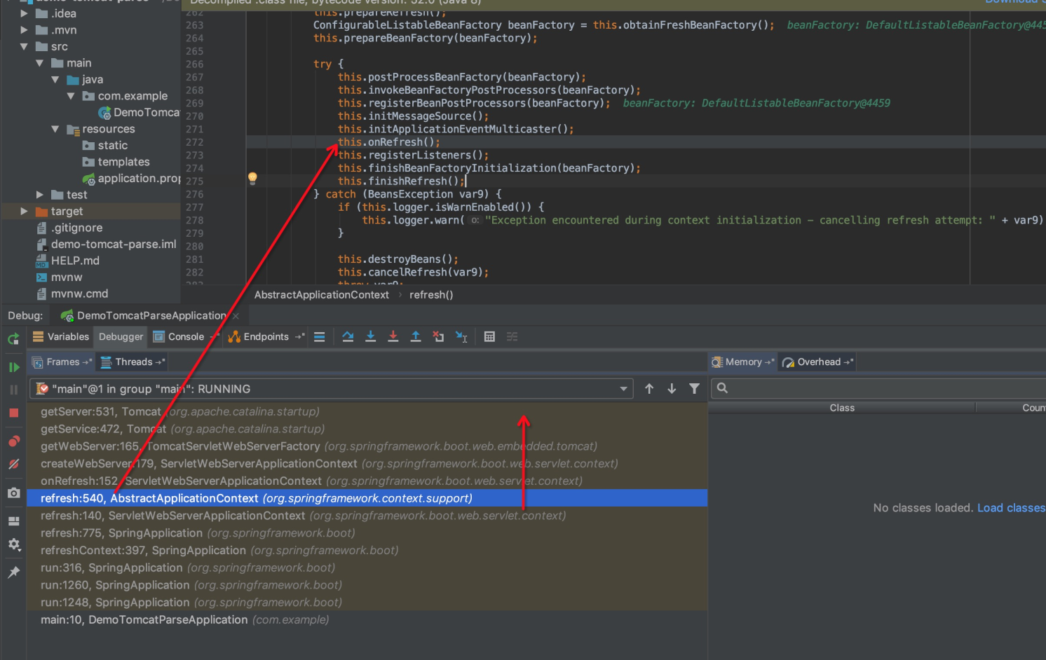 上面对 SpringBoot 中内嵌 Tomcat 的过程做了分析,这个过程实际上并不复杂,就是在刷新 Spring 上下文的过程中将 Tomcat 容器启动起来,并且将当前应用绑定到一个 Context ,然后添加了 Host。下图是程序的执行堆栈和执行内嵌 Tomcat 初始化和启动的时机。
