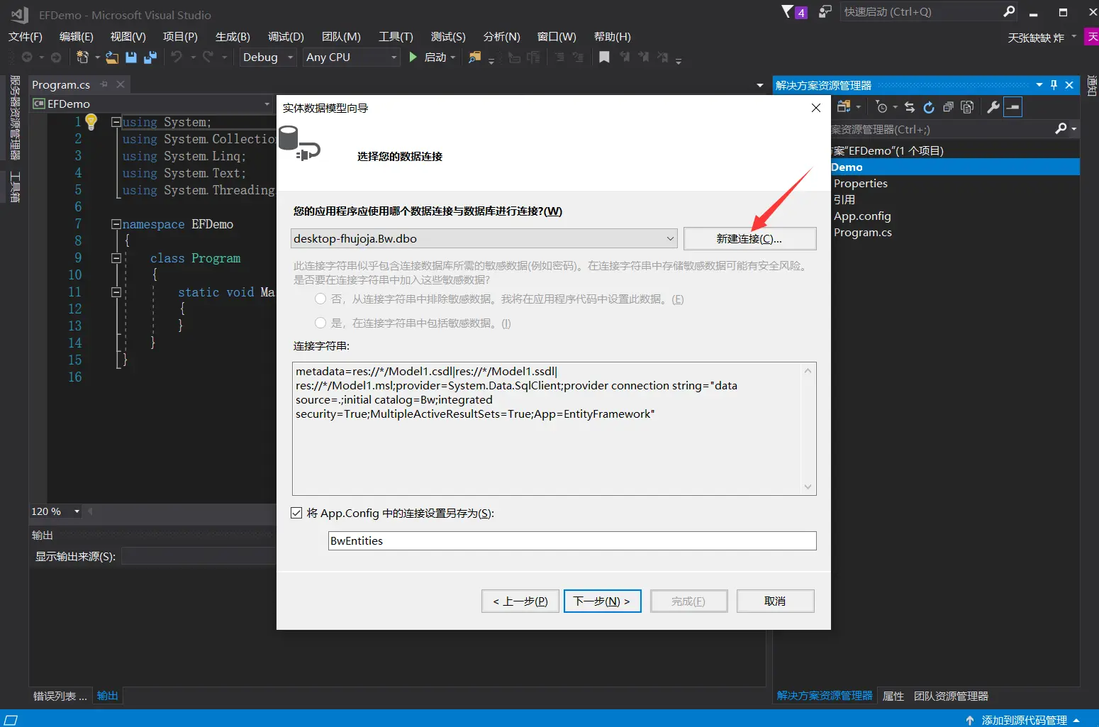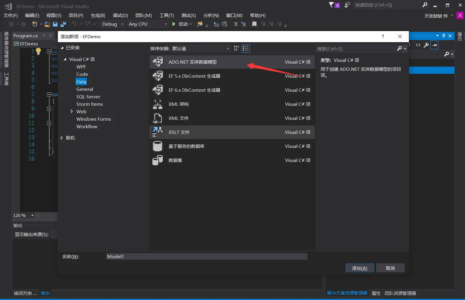 - 第一步,新建一个控制台应用程序,右键添加新建项,添加一个ADO实体数据模型