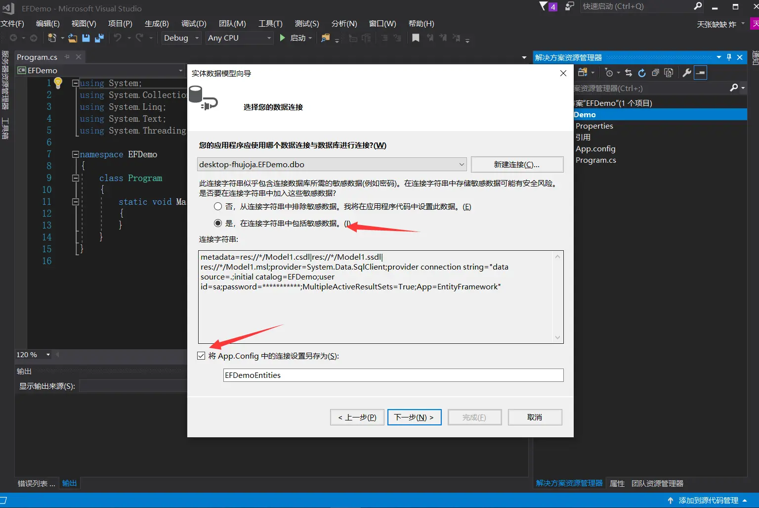 - 第五步,点是,并且勾选,如果不点是的话,你对数据库的一些访问权限会被屏蔽,还得手动去设置,勾选也一样(这里可能描述不怎么全面,不点是的话,我们会发现访问数据的连接字符串里密码会没有,没有了怎么访问数据库呢?是否勾选,可以解决我们在不同项目中连接字符串的配置问题)