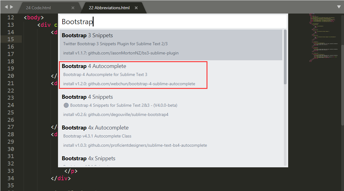 sublime3 安装 Bootstrap 命令补全插件 DevOps海洋的渔夫 2019-10-06 537 阅读1分钟 在 "Package Control: Install Packages" 搜索 Bootstrap 显示插件如下: 点击安装即可。 下面来尝试一下命令补全的效果。 可以看到各种Bootstrap的类名补全了。
