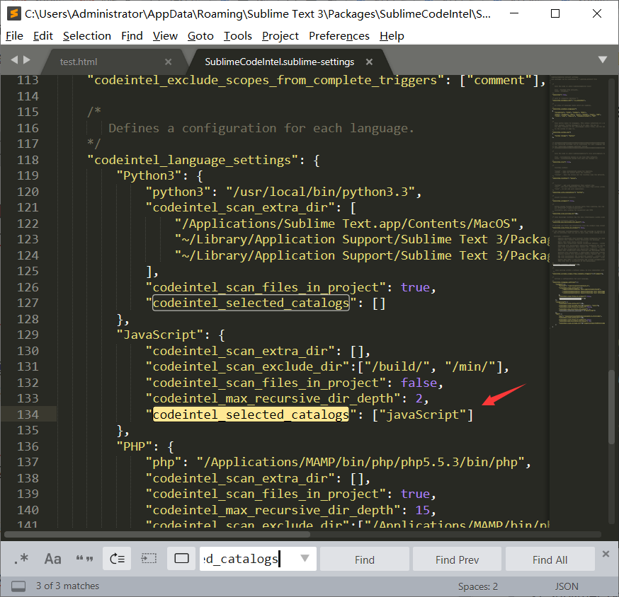 打开配置文件后,搜索codeintel_selected_catalogs ,如下: