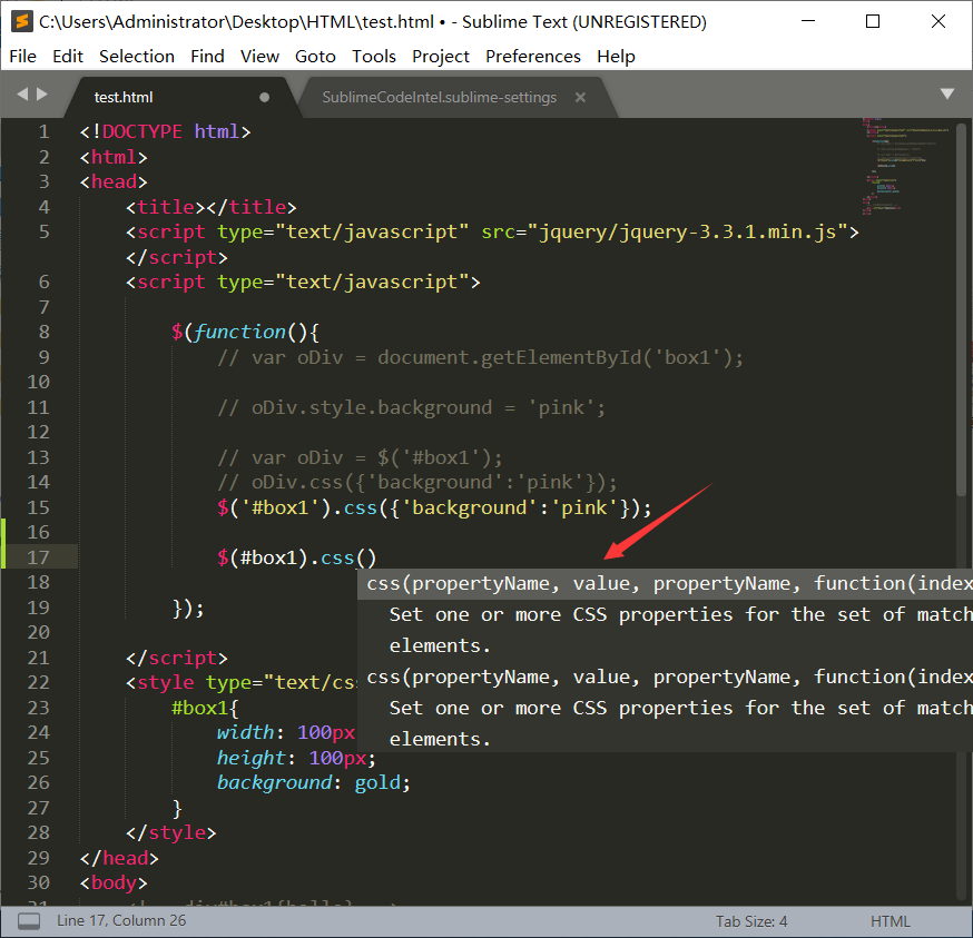 之前为了JavaScript可以自动补全,安装了SublimeCodeIntel插件,将其中jQuery的补全部分改为了JavaScript。