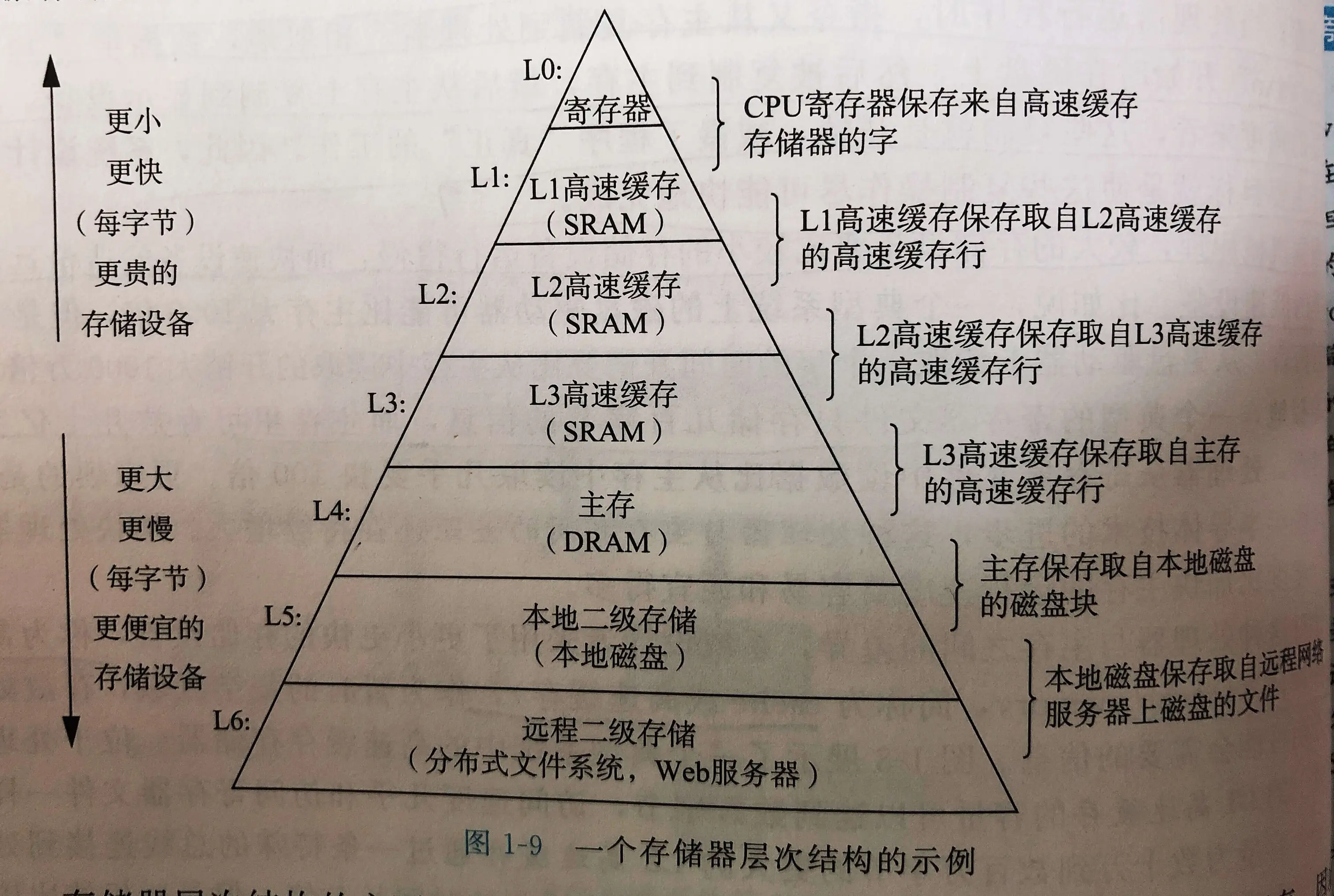 我们知道这个hello.c程序的机器指令最初是存放再磁盘上,当程序加载时,他们被复制到主存;当处理器运行程序时,指令又从主存复制带处理器.相似地,数据串"hello,world\n" 开始时再磁盘上,然后被复制到主存,最后从主存上复制到显示设备.从这个角度来看,这些复制就是开销,减慢了程序“真正”的工作.因此,系统设计者的一个主要目标就是使这些复制操作尽可能快地完成.