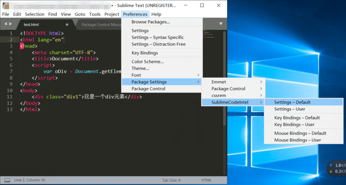 4, 关闭文件 Package Control Messages,关闭Sublime,重新打开后,打开菜单如下(英文模式为Perferences->Package Settings->SublimeCodeIntel->Setting - Defalut),打开SublimeCodeIntel配置文件。