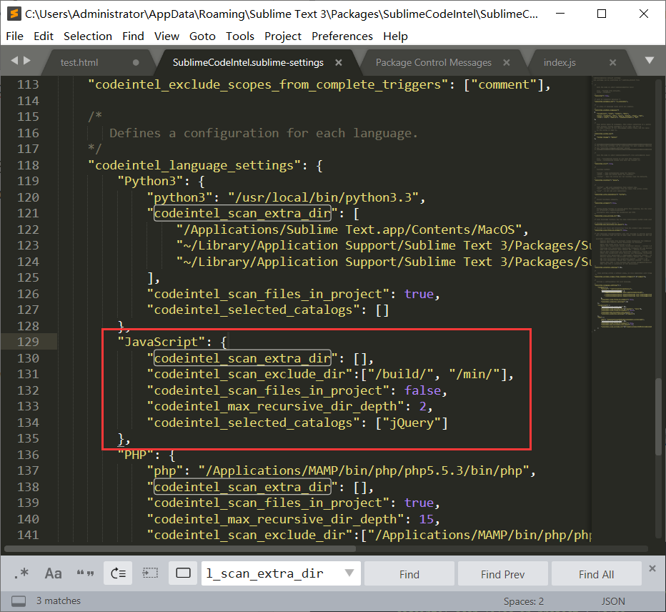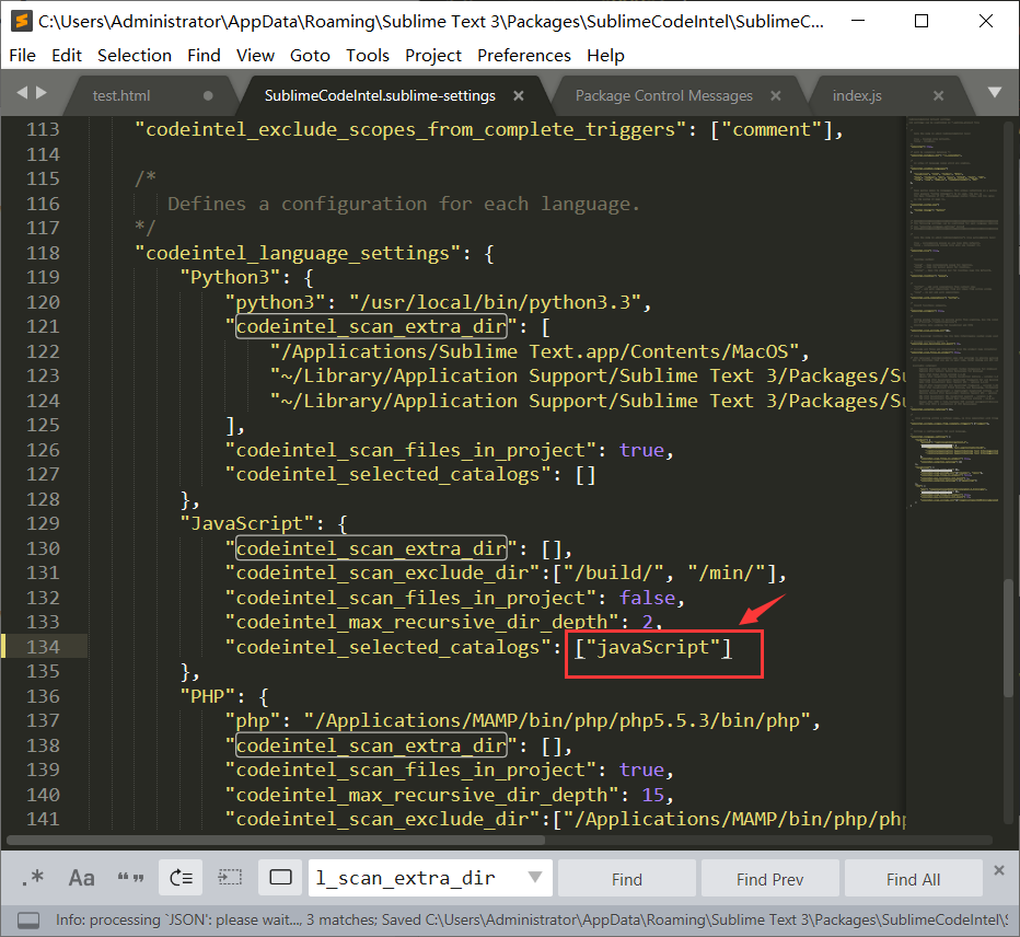 5,在SublimeCodeIntel配置文件中,找到如下节