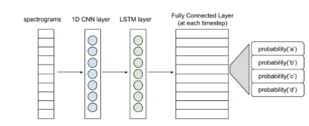 频谱图输入可以看作是每个时间步长的向量。1D卷积层从各个向量中提取出特征,形成特征向量序列,并输入LSTM层进一步处理。LSTM层(或双LSTM层)的输入则传递至全连接层。利用softmax激活函数,可得出每个时间步长的字符概率分布。整个网络将会用CTC损失函数进行训练(CTC即Connectionist Temporal Classification,是一种时序分类算法)。熟悉整个建模流程后可尝试使用更复杂的模型。