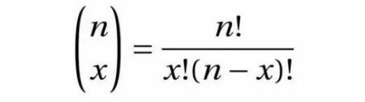 忽略左边的大括号,关注右边的实际数学部分。二项式系数可以从一组较大的数中计算出所有可能的组合。n代表更大的一组数字,和x代表希望从一组较大集合中筛出的较小集合。举个例子,假设正在进行强力球游戏,必须从49个数字中选出5个,然后从26个强力球数字中选一个1,前5个数字的公式如下: