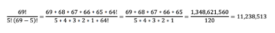 计算彩票加成的公式相当简单。名为二项式系数,如下所示: