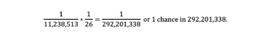 这说明一共有11238513组可能出现的5位数组合,其中只有1个是正确的,那么得到正确5位数组的几率是1/11238513。剩下的最后一个强力球的几率就更容易计算了,从26个数字中选出一个,就可以得出概率为1/26。计算两组数字组合的总概率,只需按如下公式将两组数的概率相乘: