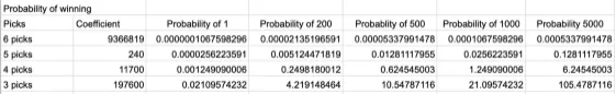 一起来看看这些可能性。Winfall游戏要求从46个可能的数字中选出6个。由二项式系数公式可以轻松得出,赢得头奖的几率是1/9366819。然而,6组数中中了5个而言胜算更大:1/1,370,754。如果是6组中中了4组呢?几率是1/163185。别忘了策略是多买彩票来增加成功的机会。假设买了500张彩票,成功的几率就会增加。比如说,中6张票的成功率是1/18734,中5张票的成功率是1/2742,中4张票的成功率是1/327。来看看这会如何发展: