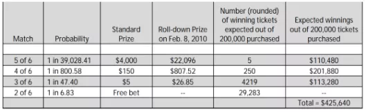 有了正确的赔率和正确的游戏,就可以从彩票中获利。一旦数学问题解决了,只要愿意投入时间和精力,加之大部分工作都是关于人力的,靠买彩票谋生的几率实际上相当可观。其实这背后有更多的数学计算,计算每张票的期望值,找到正确的数字组合来进一步增加胜算。但是,通过在一场奖金高于正常水平的游戏中,将赔率控制在2、3、4或5的范围内,即便不是头奖,麻省理工学院的学生也能够确保他们赢的几率高于1/45。这要比在扑克的一开始就同花(1/649,739),和超级名模约会(1/880,000),被闪电击中(1/1000000),或者被鲨鱼攻击(1/115000000)的几率高得多。