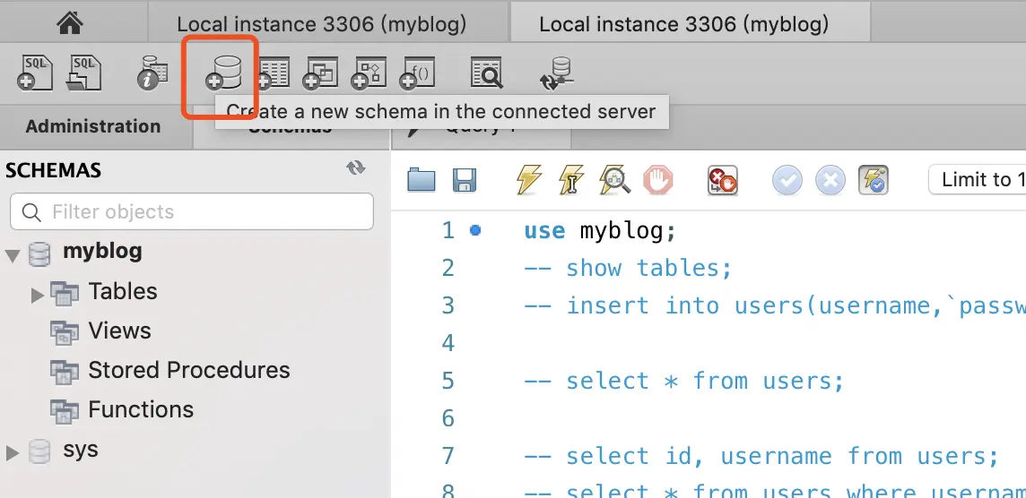 安装好mysql之后,我们可以打开workbench,点击图中标记按钮新建一个数据库myblog